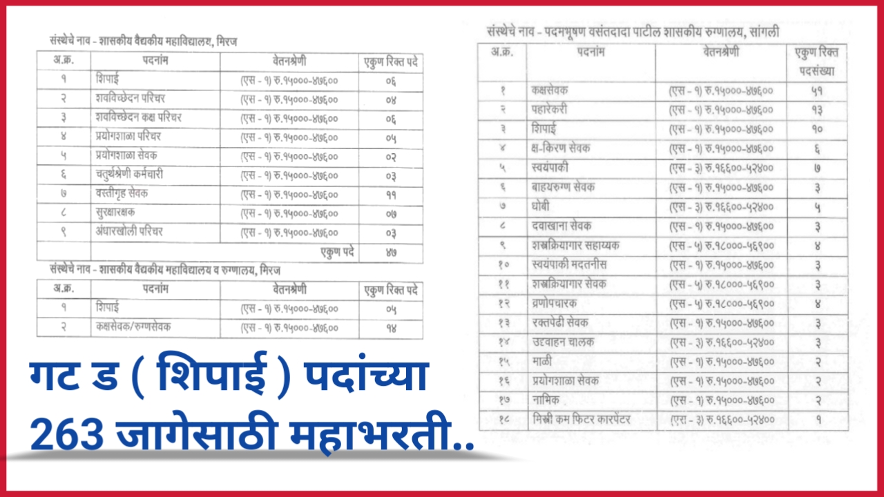 GMC : सरकारी वैद्यकीय महाविद्यालय मिरज अंतर्गत गट ड ( शिपाई ) पदांच्या 263 रिक्त जागेसाठी सरळसेवा पद्धतीने पदभरती !